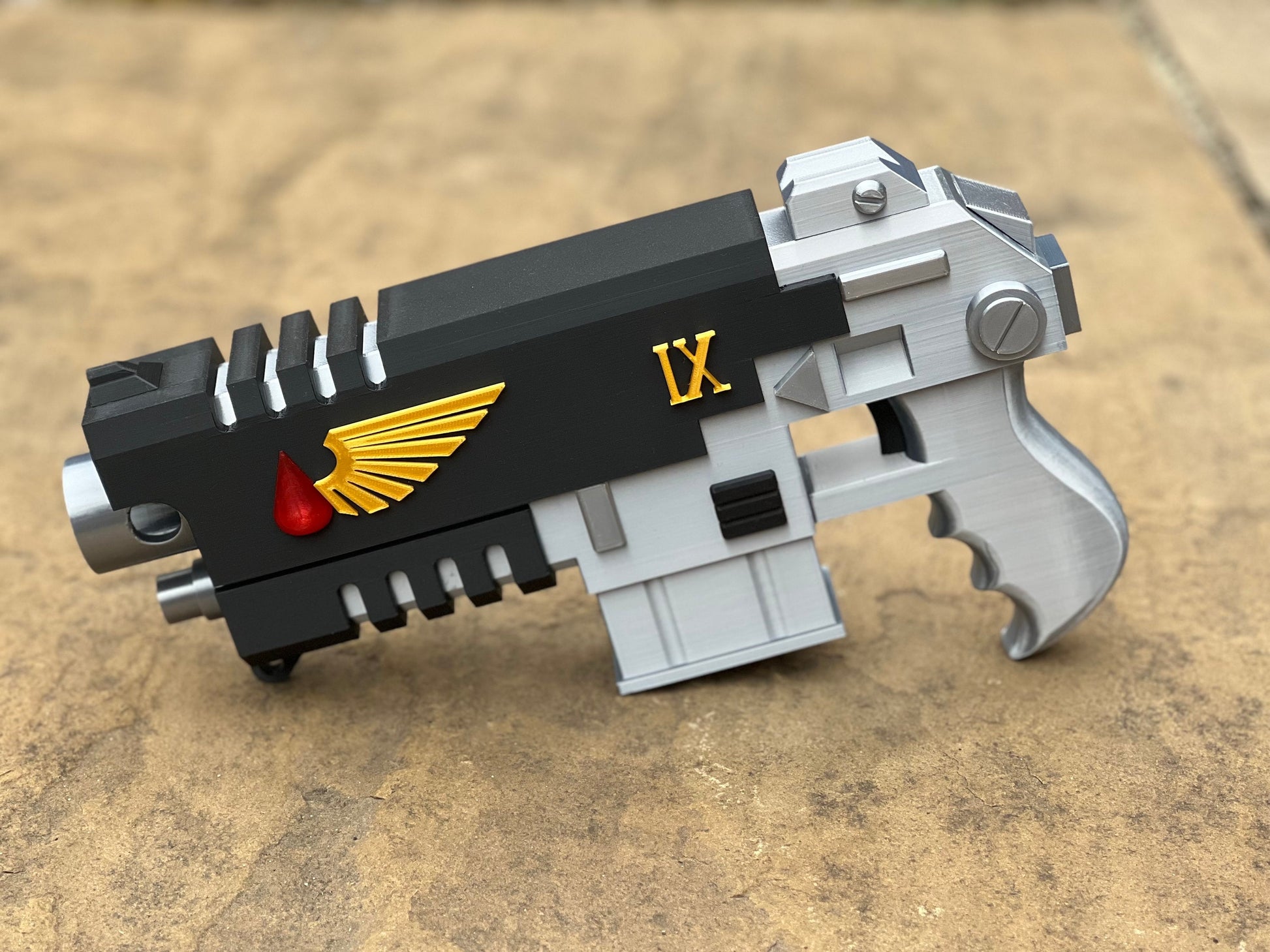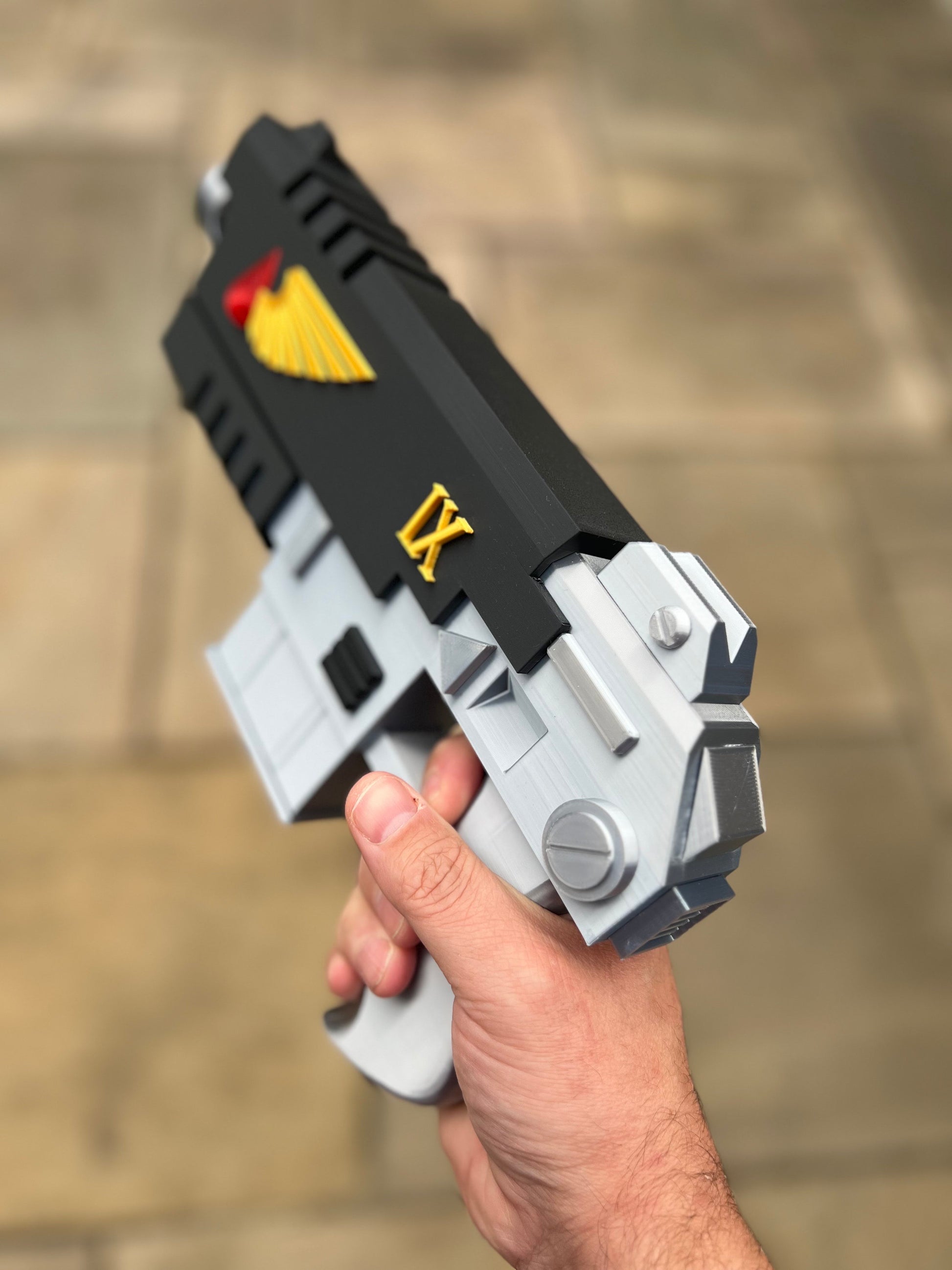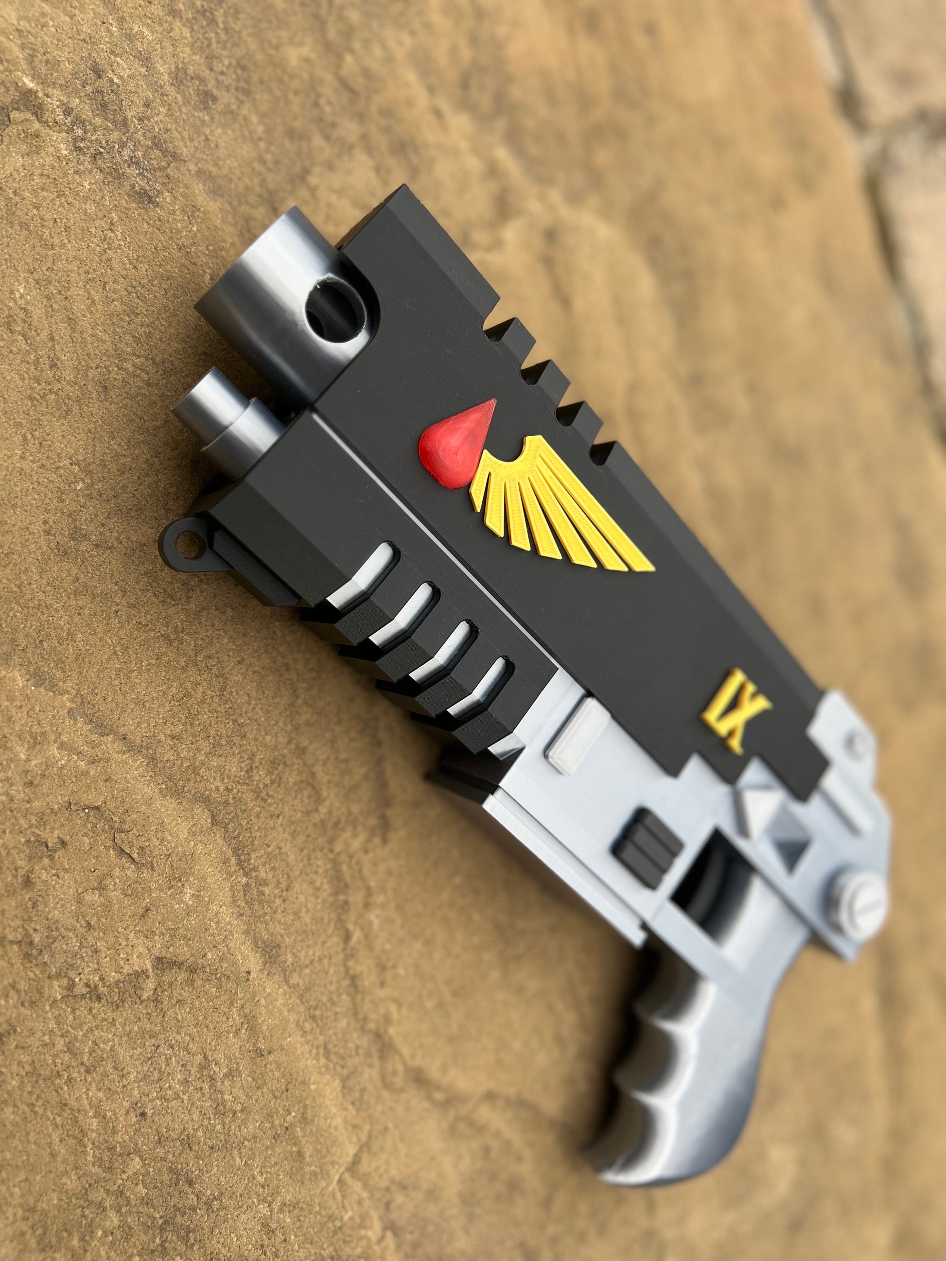 This is a 3D printed prop of the Absolver Bolt Pistol with Blood Angels theme. The item will be supplied as full colour finished prop in black, silver, gold and red.