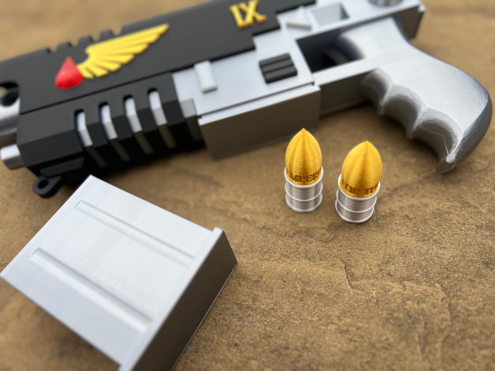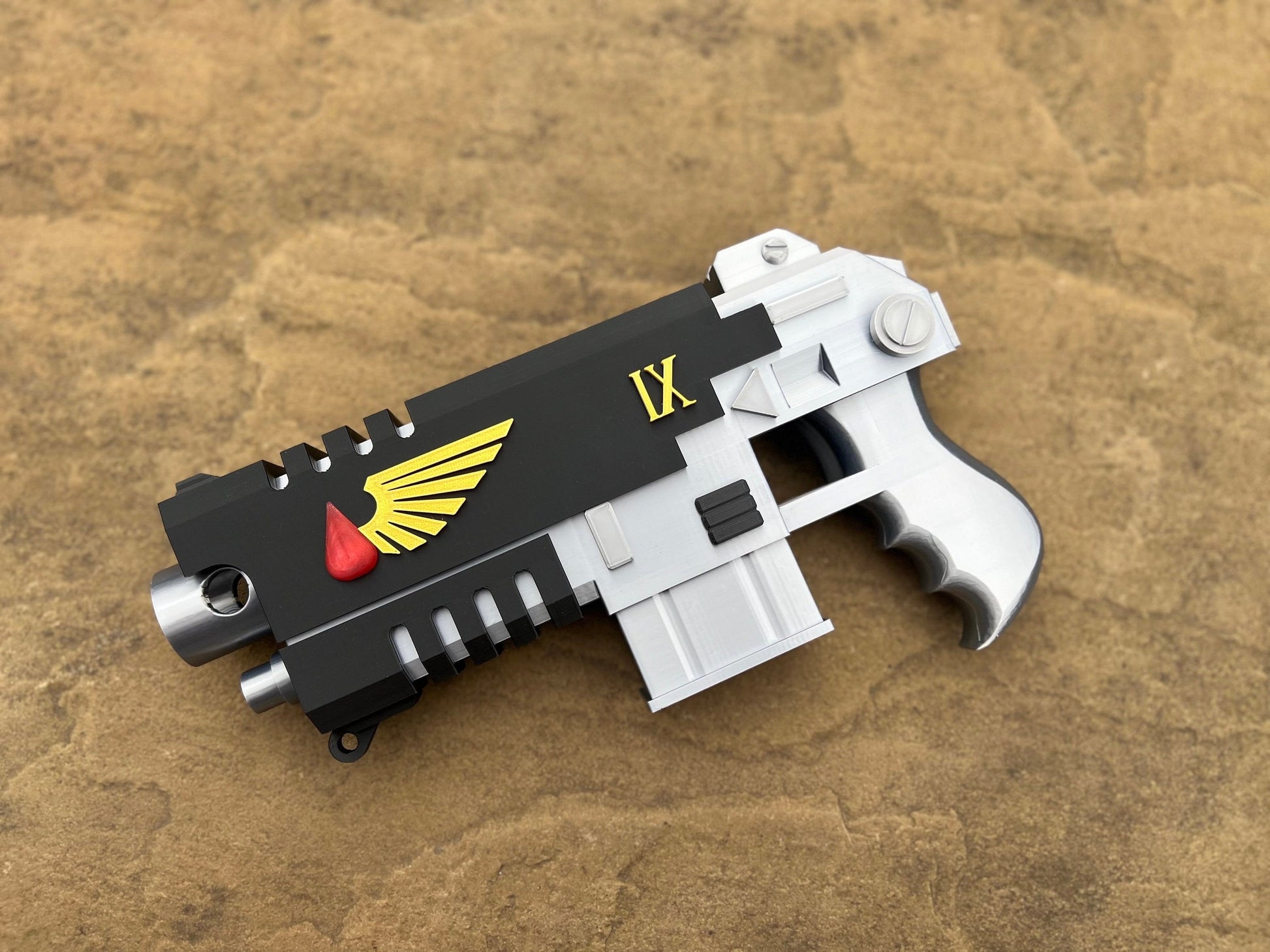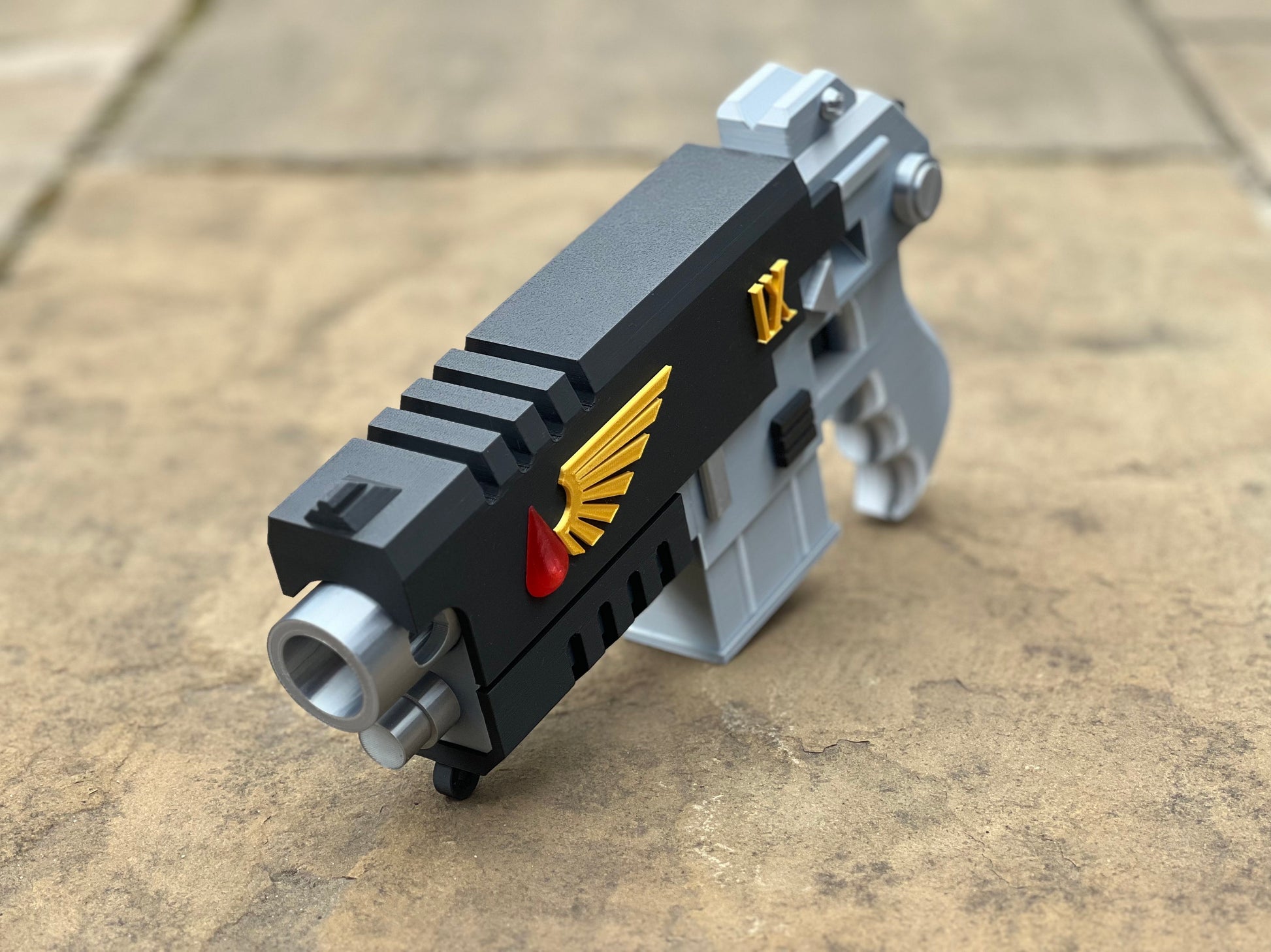 This is a 3D printed prop of the Absolver Bolt Pistol with Blood Angels theme. The item will be supplied as full colour finished prop in black, silver, gold and red.