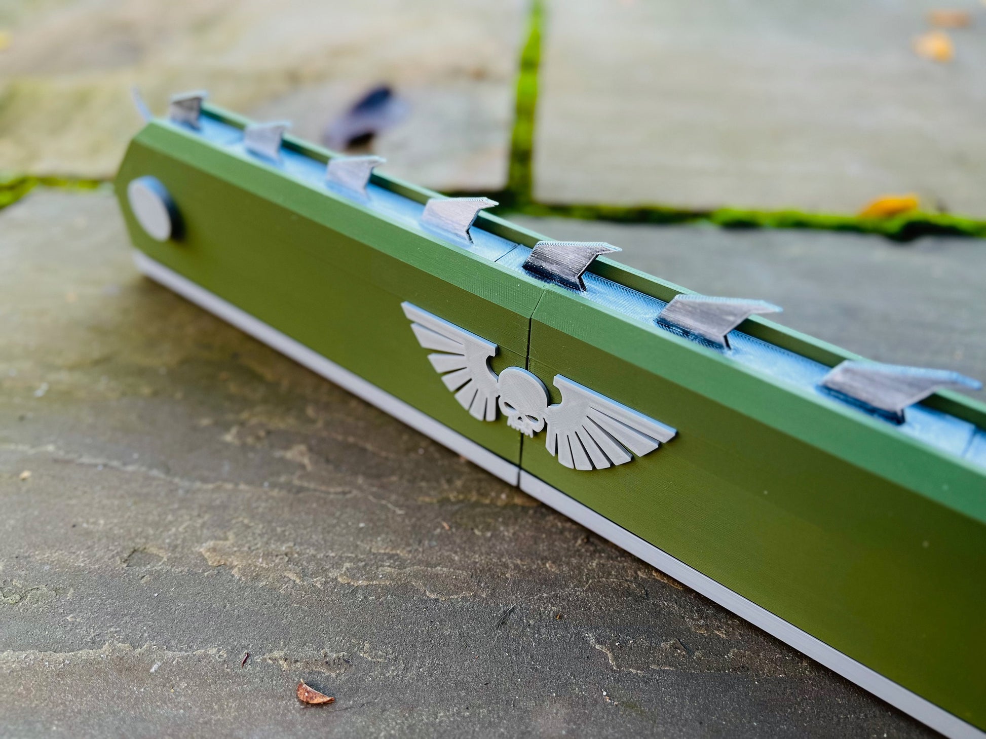 The item will be printed in Grey and Green PLA at a .2 layer height using 5 walls for added strength. Custom colours are available, please contact us for information. PLA is a sustainable and eco friendly biodegradable polyester made from plant starch. As this is FDM 3D printed layer lines will be visible when viewed up close, these easily removed by sanding and priming before painting.