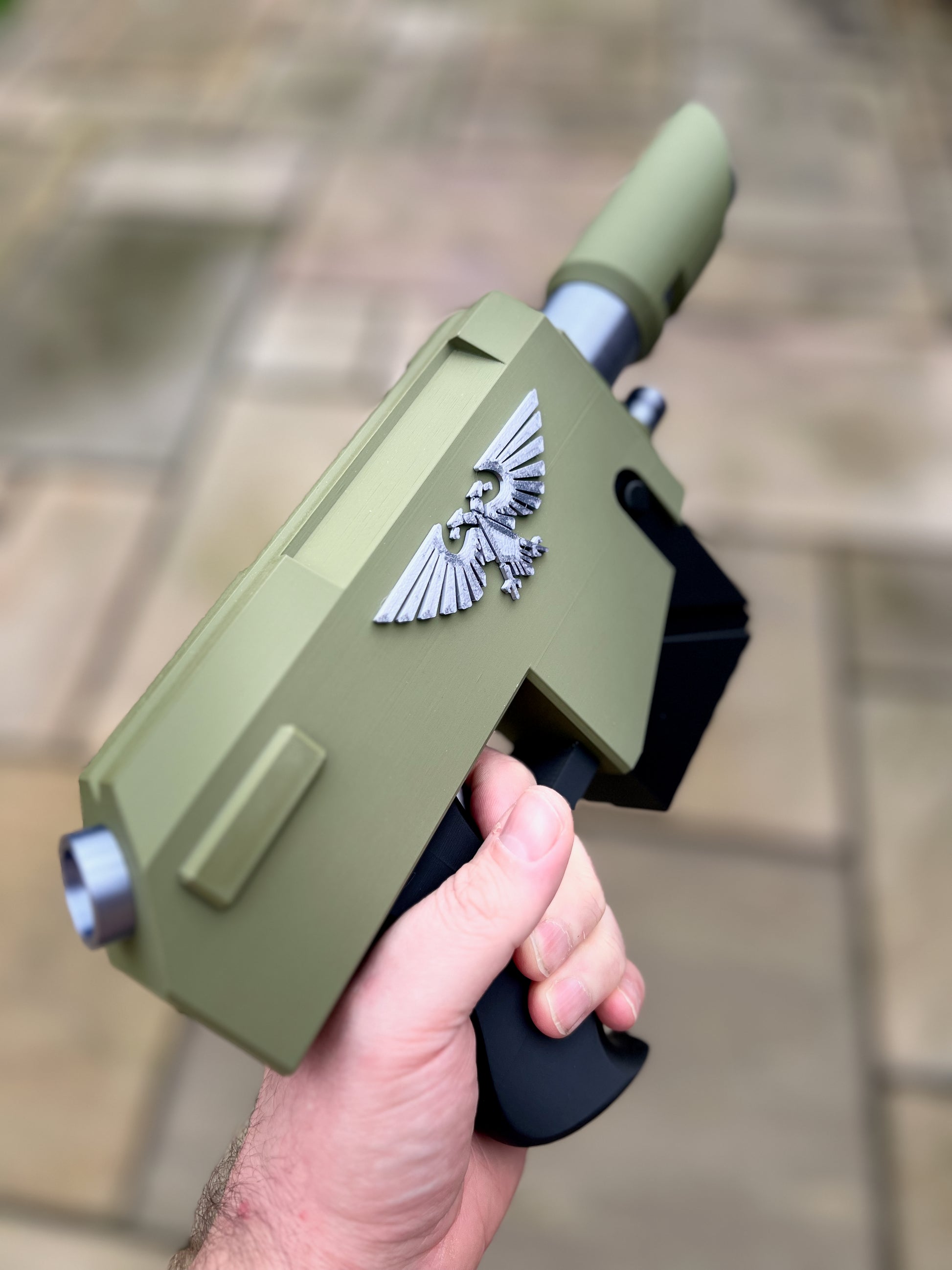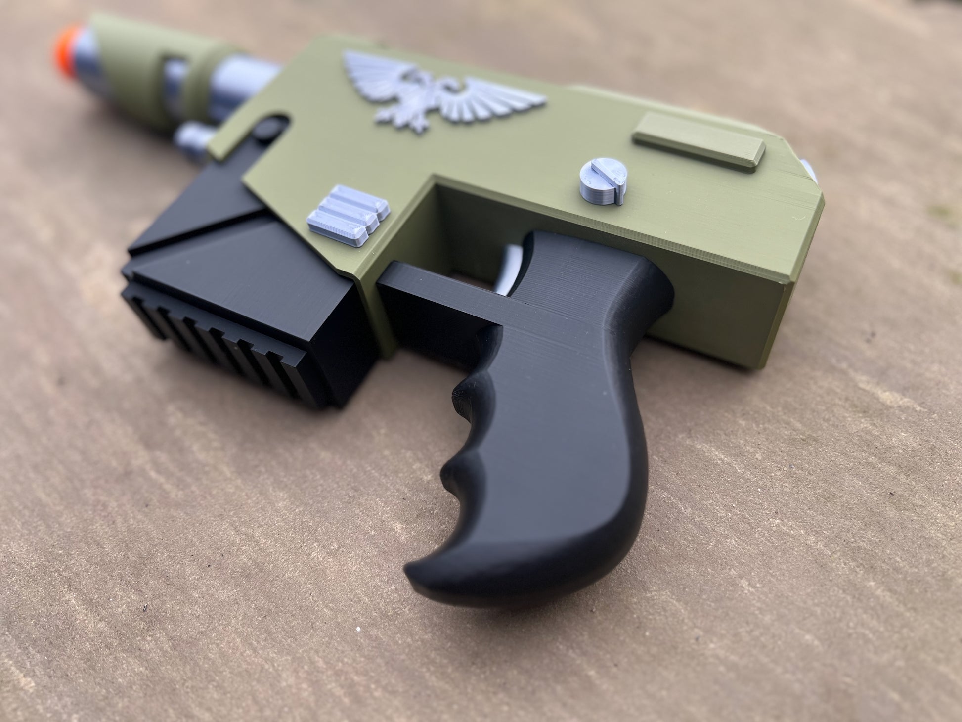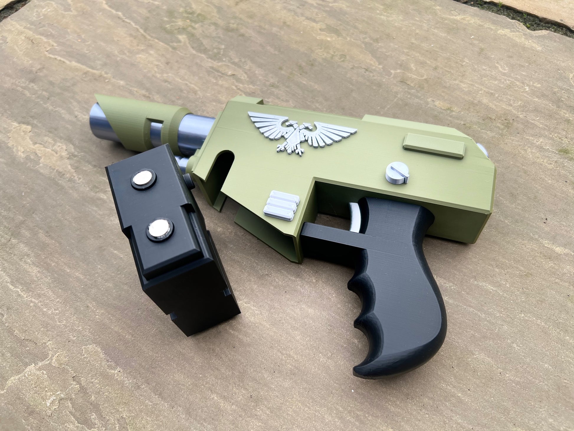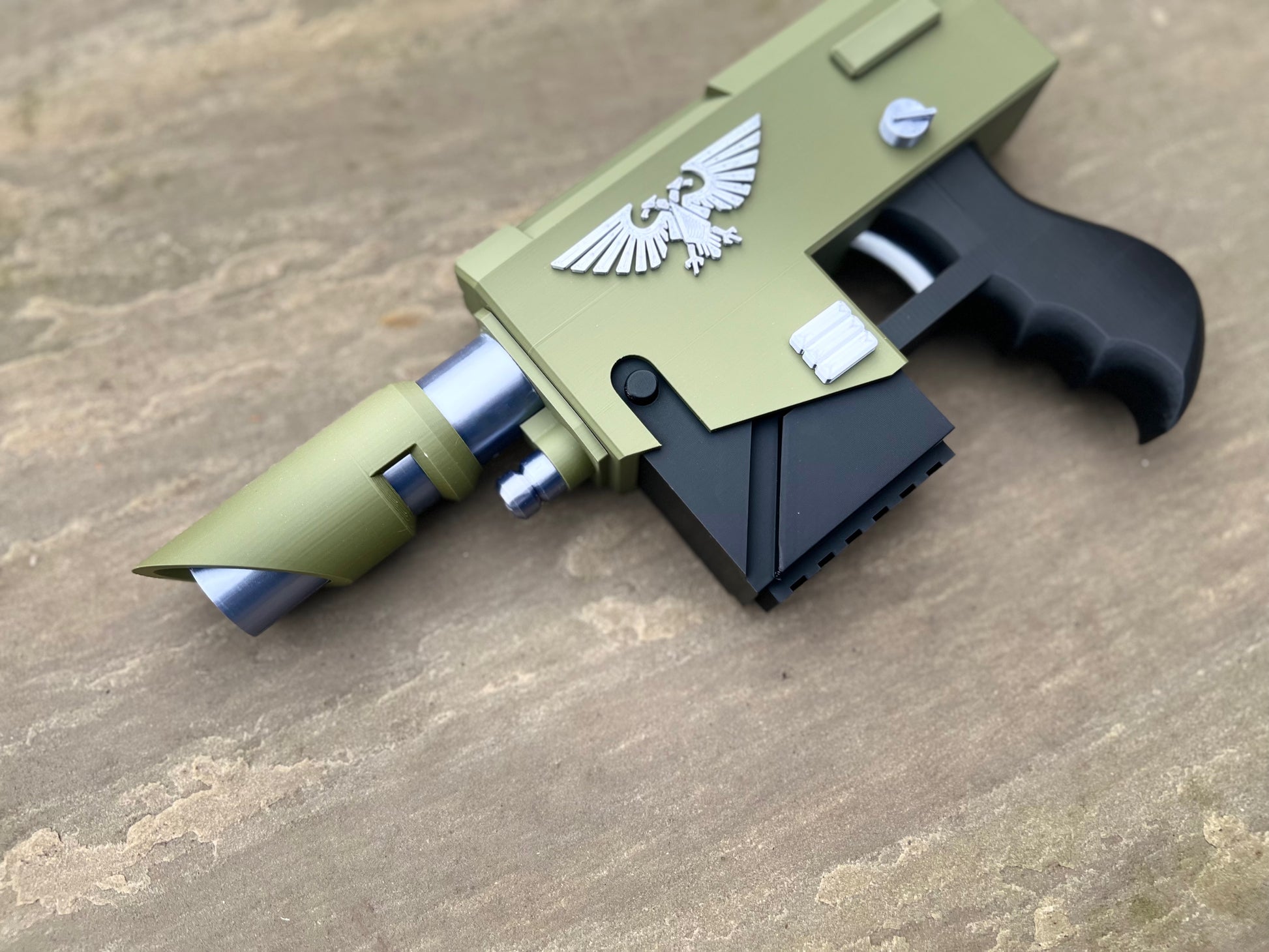 This is a 3D printed Laspistol prop for display or cosplay. The item will be supplied as a finished print in military green, black and silver.