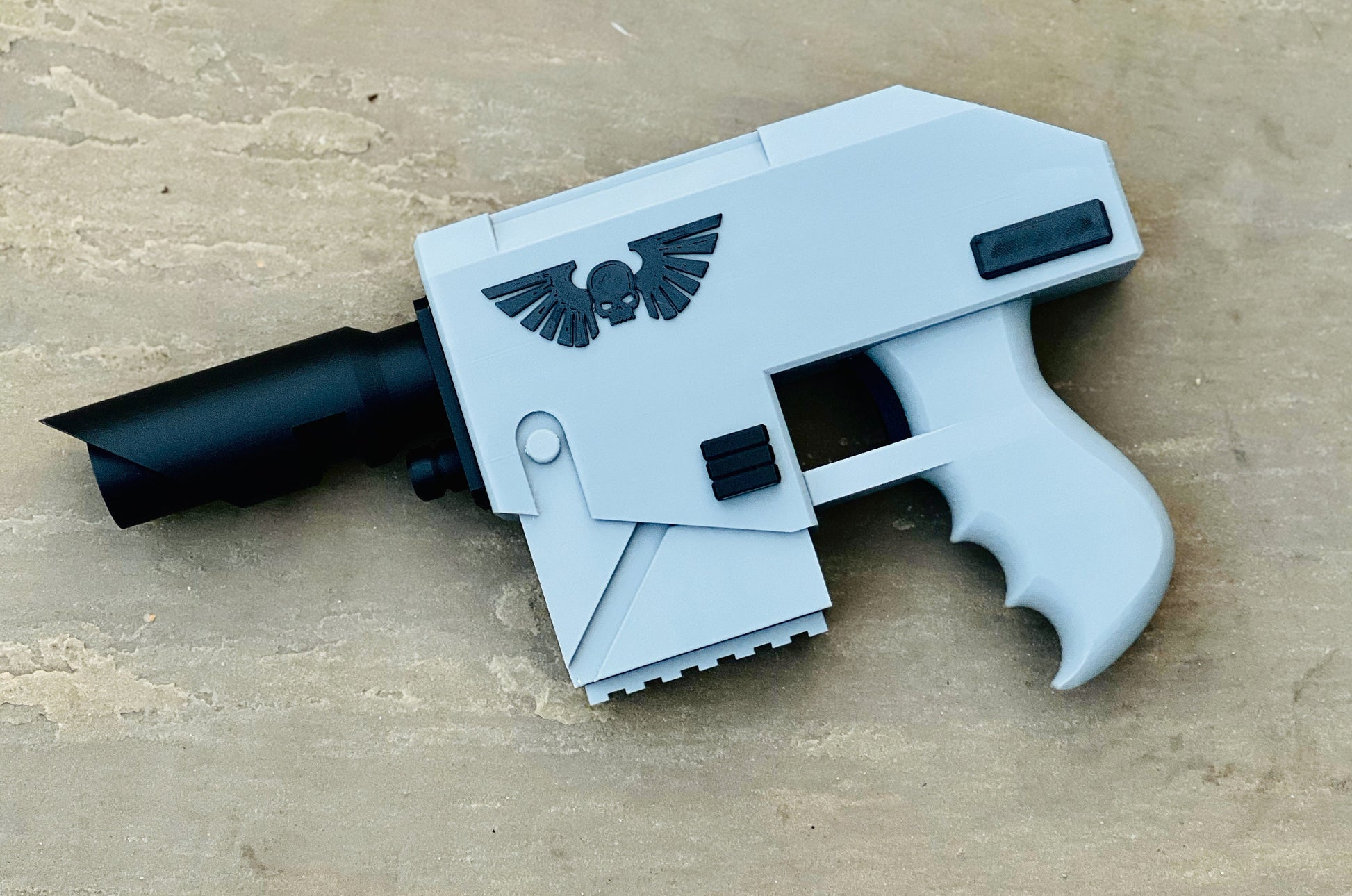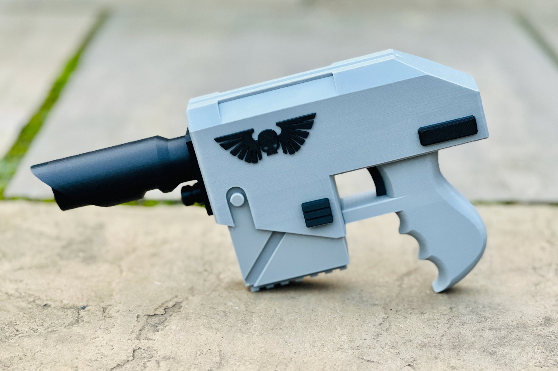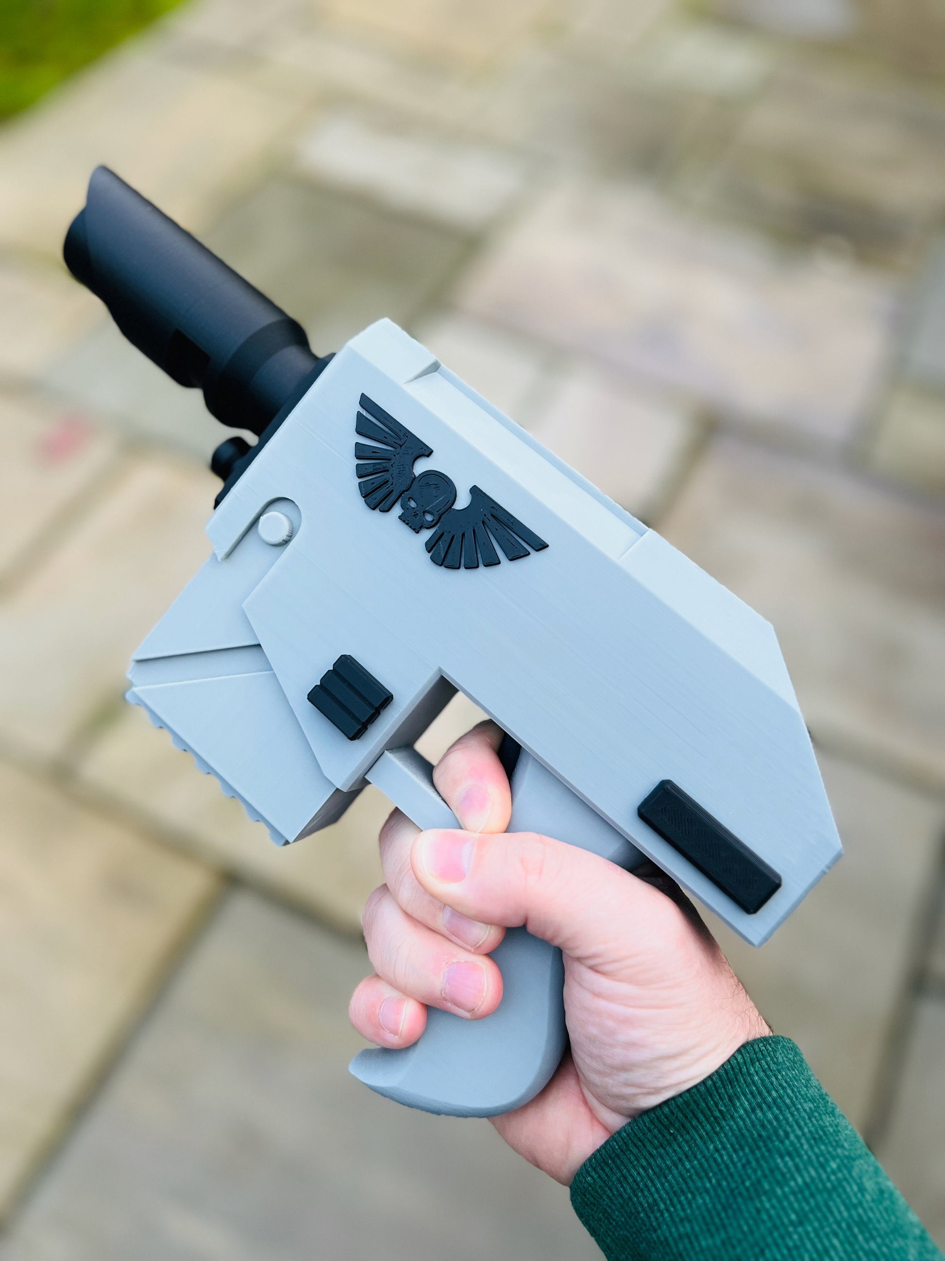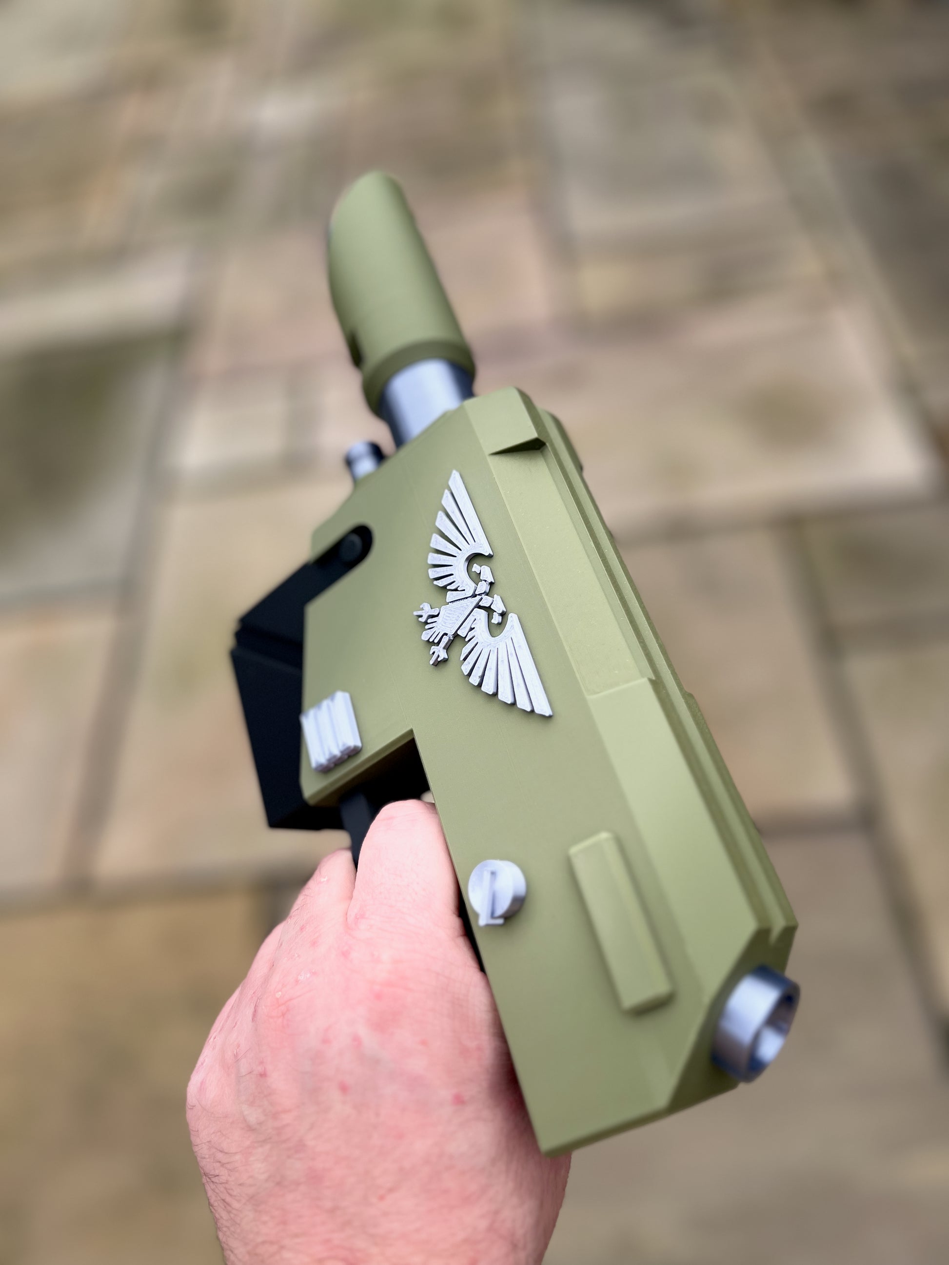 This is a 3D printed Laspistol prop for display or cosplay. The item will be supplied as a finished print in military green, black and silver.